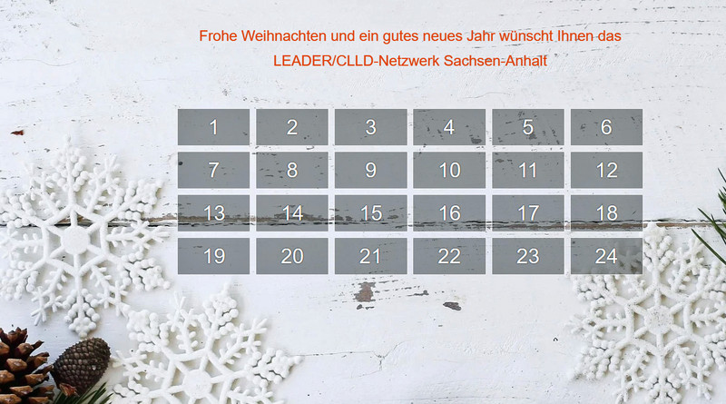 Jeden Tag ein Förderprojekt entdecken | In diesem Jahr gibt es nicht nur Schokoladen-Adventskalender: Das LEADER/CLLD-Netzwerk hat einen digitalen Adventskalender ins Leben gerufen. Hier wird an jedem Tag im Dezember bis einschließlich Heiligabend ein besonderes Vorhaben von jeder Lokalen Aktionsgruppe erlebbar gemacht. Öffnen Sie jeden Tag ein Türchen und lernen Sie somit die Lokalen Aktionsgruppen in Sachsen-Anhalt und deren Projekte näher kennen.