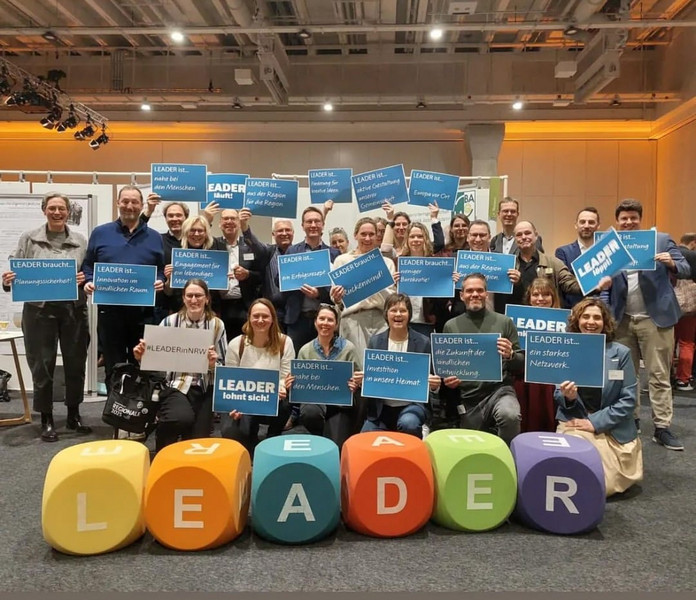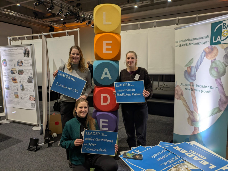 Auf dem Markt der Möglichkeiten im Rahmen des Forums präsentierten sich insgesamt 16 Ausstellende und Organisationen. Darunter auch die Bundesarbeitsgemeinschaft der LEADER-Aktionsgruppen (BAG LAG e.V.), die im Rahmen eines gemeinsamen Fototermins die LEADER-Kommunikationskampagne zur Ausgestaltung der EU-Förderperiode 2028-2034 vorstellte. Die Kampagne wurde von der Arbeitsgemeinschaft „LEADER ist…“ in Kooperation mit den Sprecherinnen und Sprechern der Regionalmanagements Niedersachsen erstellt und arbeitet die Stärken, Bedrohungen und Chancen von LEADER in Form von kurzen und prägnanten Botschaften heraus. Die LEADER-Kampagne verfolgt das Ziel, in kurzer Zeit für alle möglichen Gesprächspartnerinnen und Geschäftspartner (Zuhörer- und Leserschaft) die Grundbotschaft (Message) zu vermitteln, dass das Erfolgsprogramm LEADER beibehalten werden muss. Die erarbeitete Kampagne ist als Vorschlag für eine gemeinsame Kommunikationskampagne für alle LEADER-Regionen in Deutschland zu verstehen und soll dabei helfen, mit einfachen Mitteln die eigene Mediennutzung im Zusammenspiel mit den anderen Regionen effektiv zu gestalten.